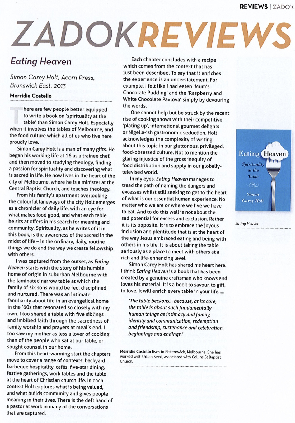 Merridie Costello has written a very generous review of Eating Heaven in the Autumn issue of Zadok Perspectives.