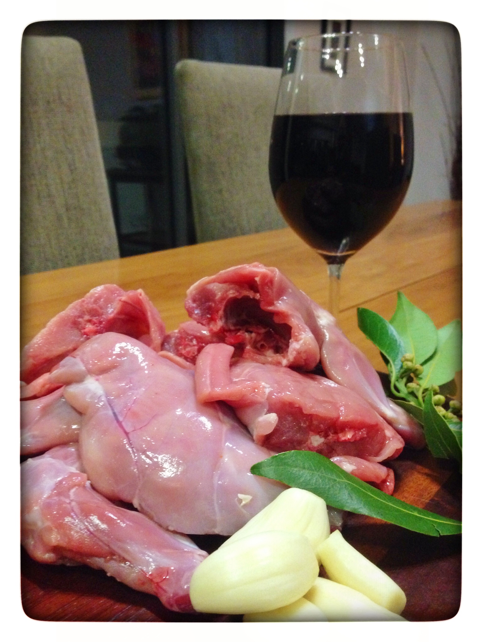 - I put the rabbit pieces in a large bowl and added the wine, 3 of the bay leaves and 3 garlic cloves. I covered the bowl in glad-wrap and placed in the refrigerator overnight.